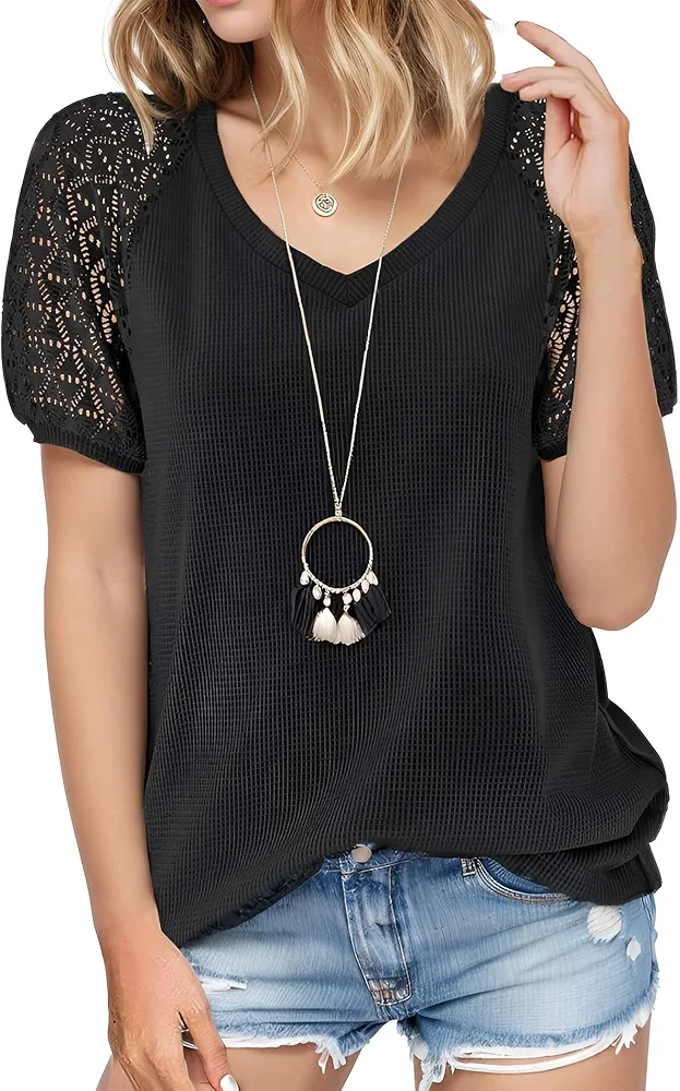 - التصميم: تتميز هذه البلوزات ذات الرقبة على شكل حرف V بتصميم أنثوي وأنيق بقبة V يبرز خط الرقبة، مما يخلق مظهرًا نحيفًا. تم تصميم الأكمام القصيرة كأكمام فانوس مع خياطة رقيقة من الدانتيل، مما يضيف لمسة من النعومة والرومانسية وإحساس أنيق راقي.