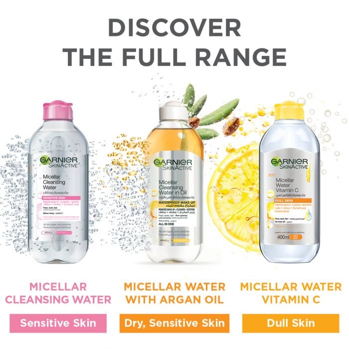 - غارنييه ماء ميسيلار مزيل المكياج بالفيتامين سي لتعزيز نضارة البشرة – ٤٠٠ مل