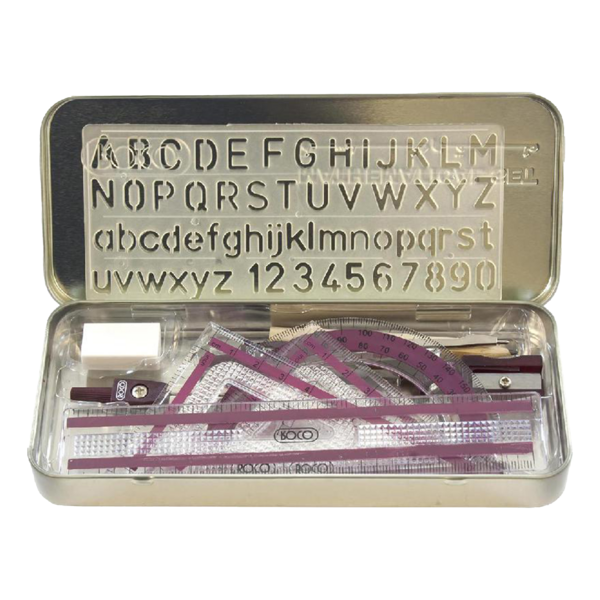 تتكون من أدوات أساسية مثل الفرجار، ومسطرة 15 سم، ومنقلة، ومثلث 60 درجة، ومثلث 45 درجة، وقلم رصاص، ومبراة، وممحاة، واستنسل