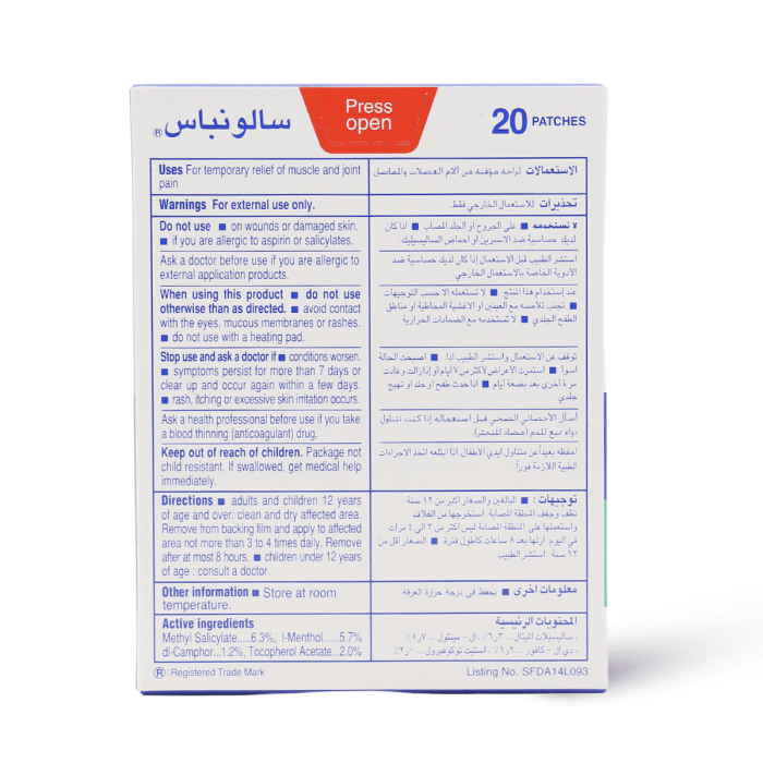 - سالونباس لصقات لتخفيف الألم حجم صغير 6.5X 4.2 سم – 20 قطعة