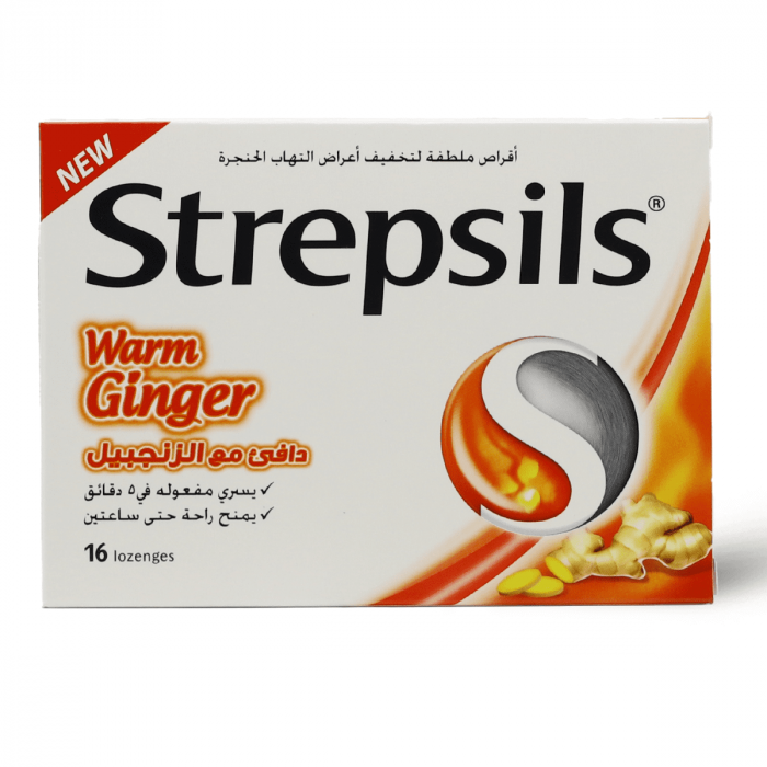 - ستربسلز، أقراص استحلاب، لأعراض التهاب الحلق، نكهة الزنجبيل – 16 قطعة