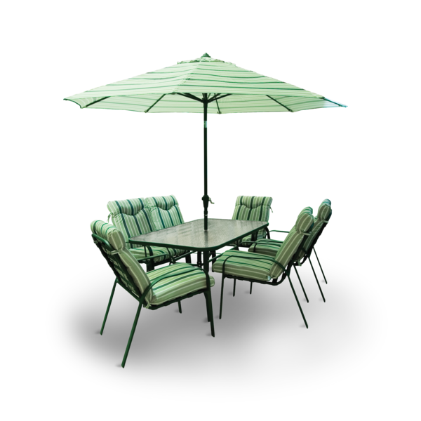 يشمل 8 قطع: 6 كراسي، طاولة ومظلة
