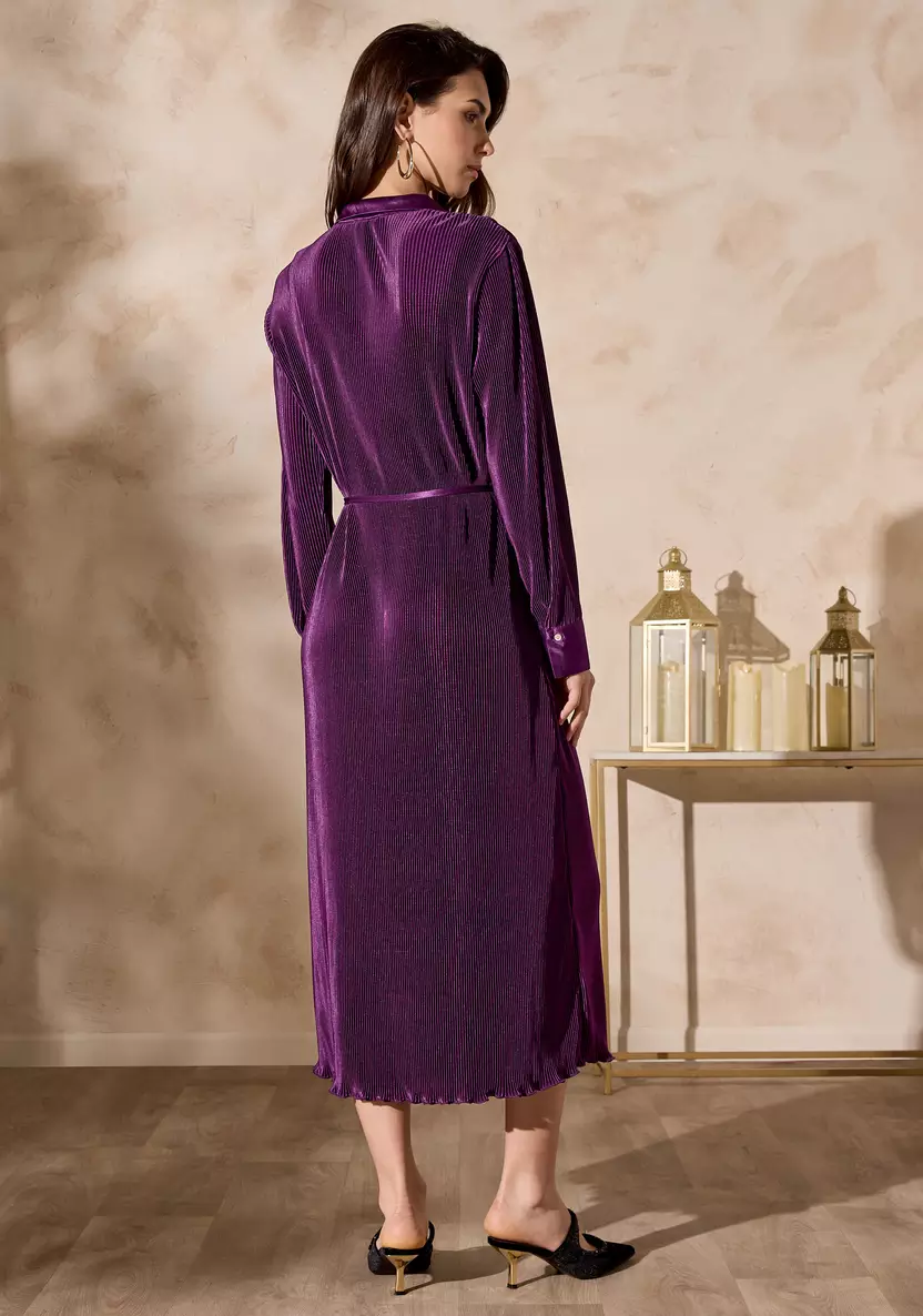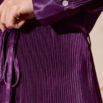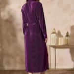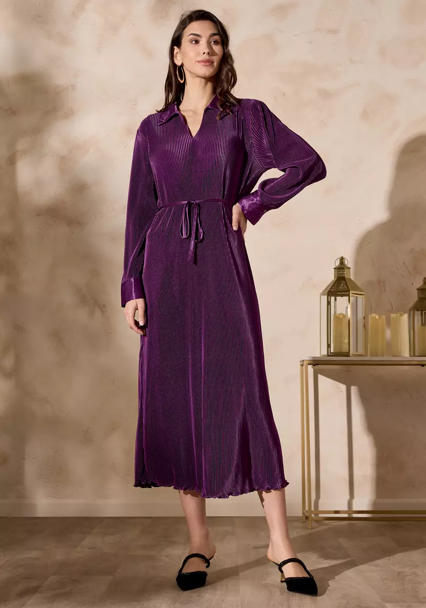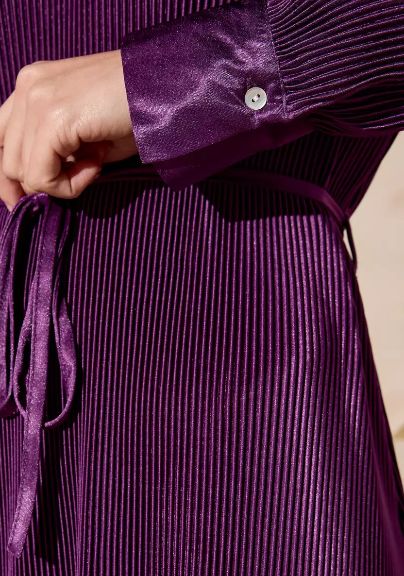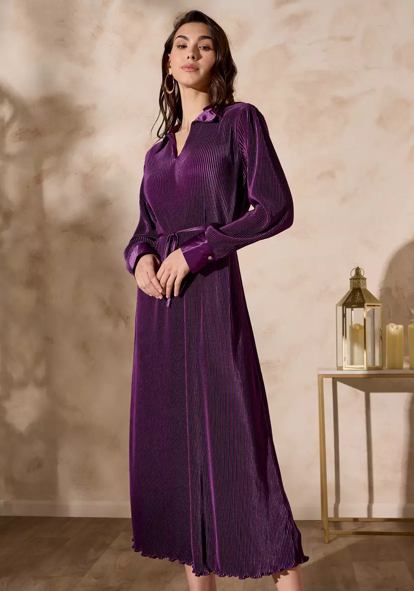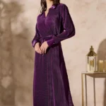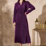 تألقي بإطلالة أنيقة مع هذا الفستان المثني الرائع، الذي يتميز بياقة أنيقة وحزام ربط جذاب. يتمتع بنسيج غني وتدفق ساحر يجعله مثاليًا للمناسبات الخاصة أو لأمسية راقية. استمتعي بأناقة خالدة مع لمسة عصرية.