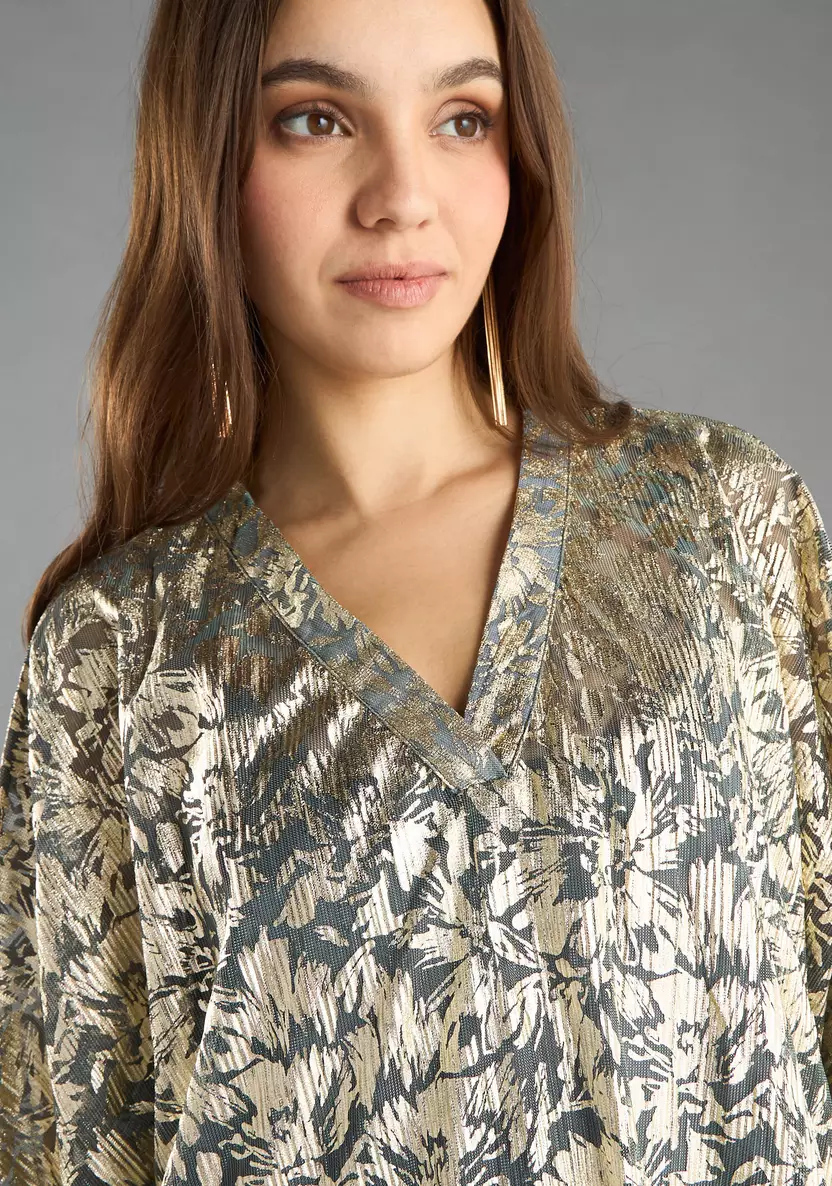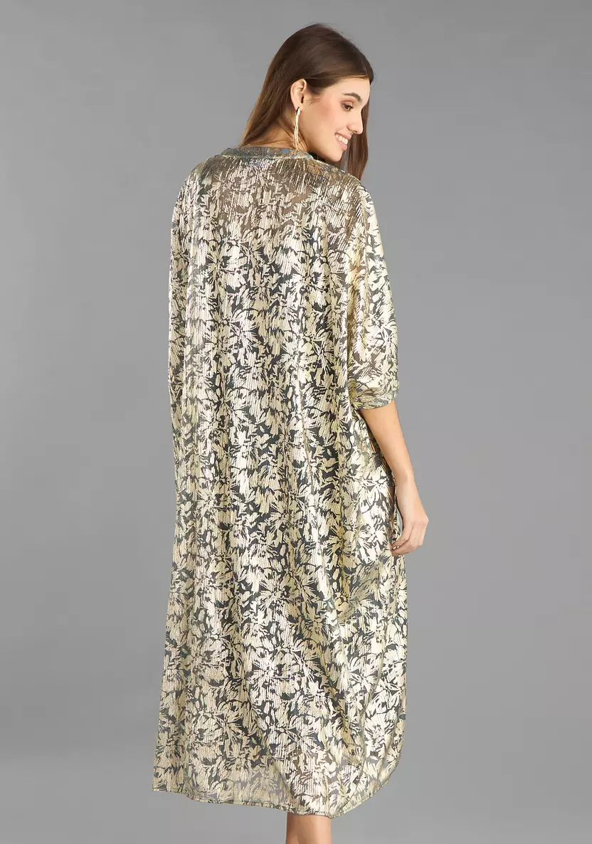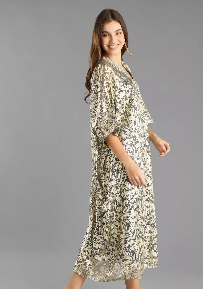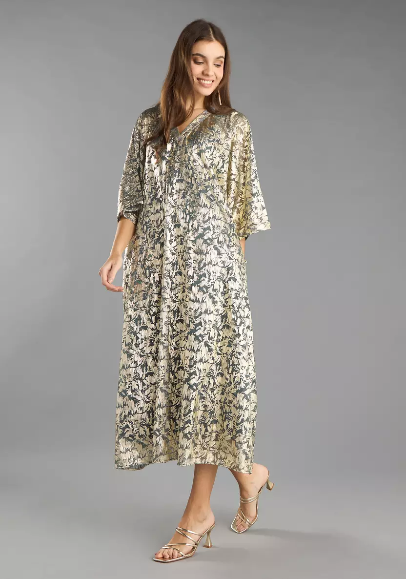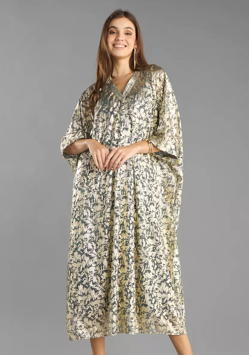 تحلي بإطلالة راقية بارتداء هذا الفستان القفطان الرائع، مصمم بياقة V وبطبعات فويل ساحرة، ومصنوع من خامات ناعمة ولطيفة على البشرة، وينسدل على جسدك بأناقة ليمنحك مظهرًا جذابًا.