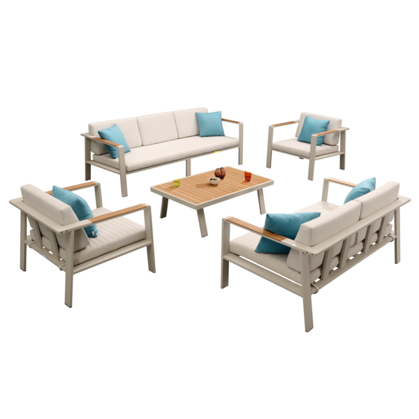 تمتع بالاسترخاء في الهواء الطلق مع مجموعة الجلوس الخارجية الرائعة من HiGold. تتميز هذه المجموعة الأنيقة والمينيماليستية بتصميم عصري يناسب جميع الأذواق. مصنوعة من الألومنيوم القوي ومادة القماش المريحة، تتكون المجموعة من 5 قطع وتشمل 7 مقاعد لتسع جميع أفراد العائلة والأصدقاء. المزيج اللوني من البيج والأزرق يضفي لمسة أنيقة على مساحتك الخارجية.