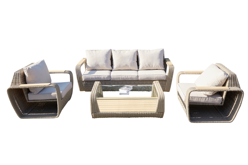 استمتع بأوقاتك في الهواء الطلق بأناقة مع مجموعة الجلوس الخارجية من ليفينغ أكسينتس. مصنوعة من الألومنيوم والروطان المتين، توفر لك هذه المجموعة راحة تصميمية مميزة مع لمسة جمالية عصرية. تتألف من أريكة بثلاثة مقاعد، كرسيين بذراعين، وطاولة قهوة لتلبية جميع احتياجاتك الخارجية.