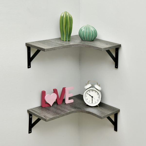 أضيفي المزيد من الأناقة إلى جدرانك مع طقم الأرفف للزاوية عالي الجودة المكون من قطعتين من هوني بي، والذي يتميز بتصميم جذاب باللونين الرمادي والأسود. مع تصميم على شكل حرف L لمزيد من الأناقة والمساحة. وهو مصنوع من الام دي اف وقشور الميلامين الخشبية والمعدن لضمان المتانة وسهولة التركيب على الحائط.